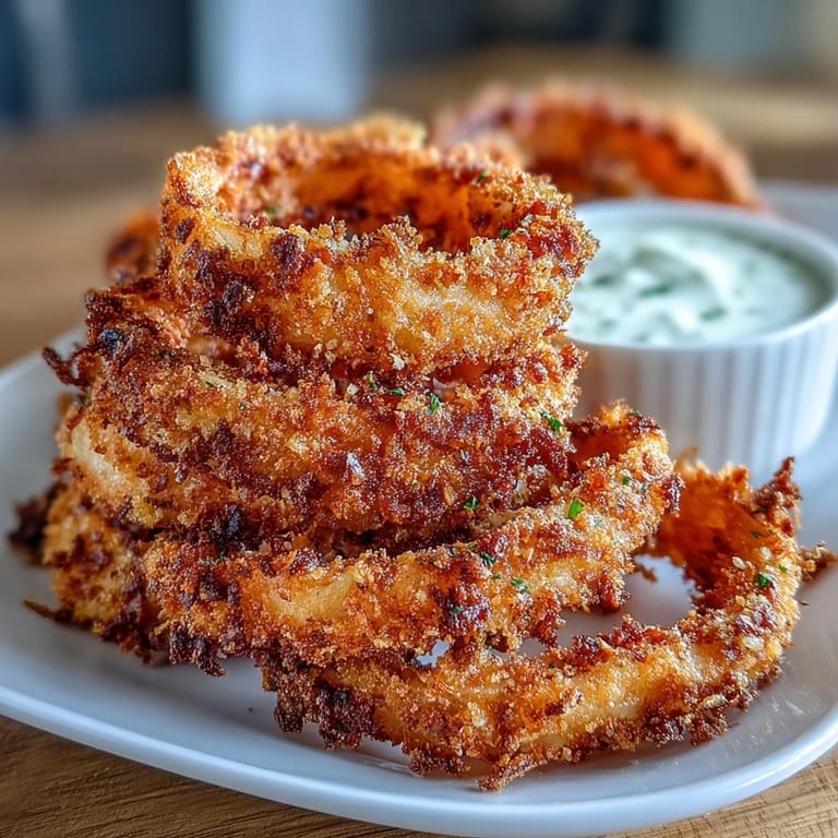 Pin It My neighbor stopped by one evening with her air fryer still warm from the box, asking if I could help her test it out. We pulled two large onions from my crisper drawer and within minutes, the kitchen filled with the most irresistible aroma of crispy, golden rings. There's something about that first batch emerging from the air fryer basket, still sizzling and impossibly crunchy, that made us both abandon our original dinner plans entirely. One bite of the homemade garlic aioli, and she declared it better than any takeout version. That night turned into the kind of cooking moment you never forget.