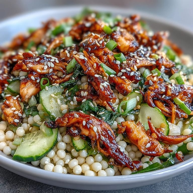 Pin It There's something about the way sesame oil hits the air when you crack open that bottle—sharp, toasty, almost alive. I stumbled onto this couscous salad on a sweltering afternoon when I had rotisserie chicken left over and absolutely no energy to cook. Instead of defaulting to the usual boring chicken sandwich, I grabbed pearl couscous from the pantry and started building layers of texture and brightness. Twenty minutes later, I had something so vibrant and satisfying that it became my go-to weeknight dinner.