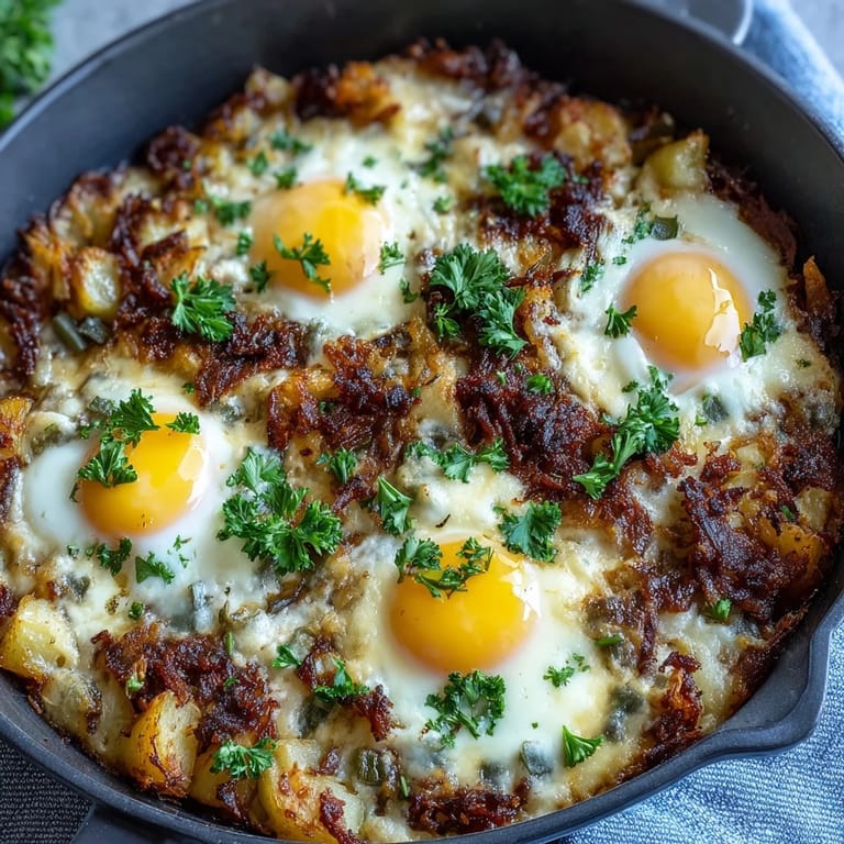 The beauty of this breakfast skillet lies in its layers of flavor. Yukon Gold potatoes turn golden and crispy in butter and olive oil, while sautéed onions, bell peppers, and garlic build a fragrant base. Diced corned beef gets deliciously crispy as it mingles with smoked paprika and black pepper, creating a hash that's both savory and satisfying. The eggs, nestled into wells in the hash and cooked to your preference, tie everything together with their creamy yolks.