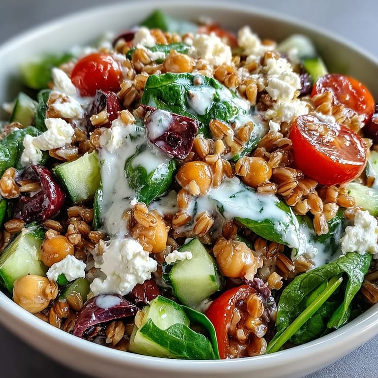 Pin It There's something almost meditative about the moment when you're standing at the farmer's market on a warm afternoon, watching the vendor arrange ruby-red tomatoes in neat rows, and you suddenly think: I'm going to build something with all of this. That's when the Mediterranean farro bowl entered my kitchen—not from a cookbook, but from that spontaneous impulse to gather bright vegetables and let them speak for themselves over chewy, satisfying grains.