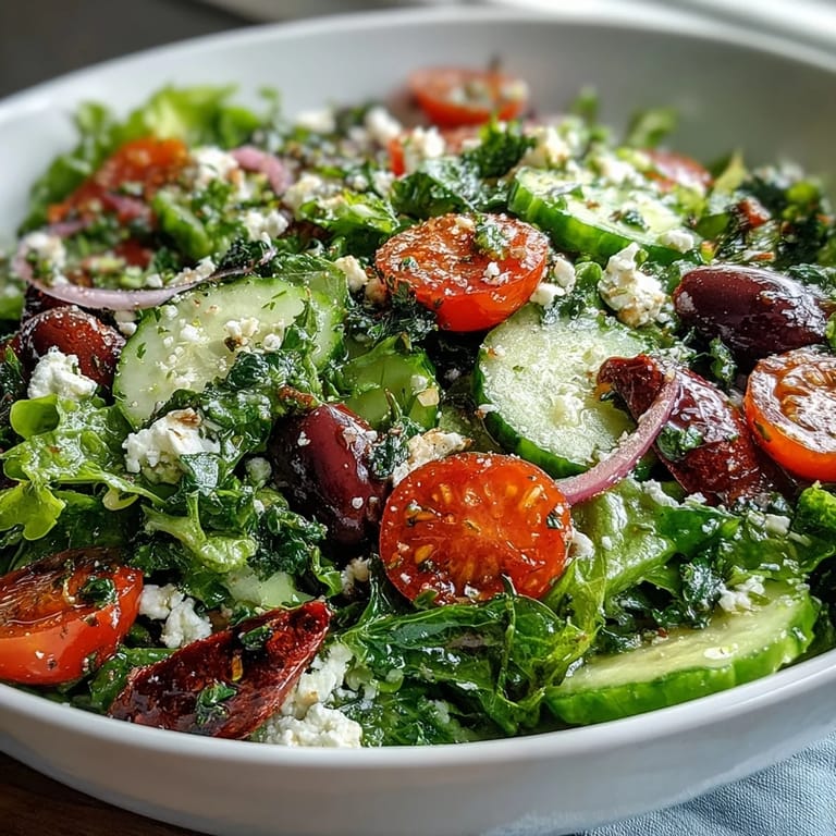 Pin It There's something about a Mediterranean salad that stops you mid-afternoon and makes you want to sit outside, even if it's just at your kitchen counter. I stumbled into making this one properly years ago when a neighbor brought over a jar of her homemade dressing, and suddenly those plain greens transformed into something that tasted like a small vacation. It's become my go-to when I need something that feels effortless but tastes intentional, and honestly, it's saved countless dinners when I forgot to plan ahead.