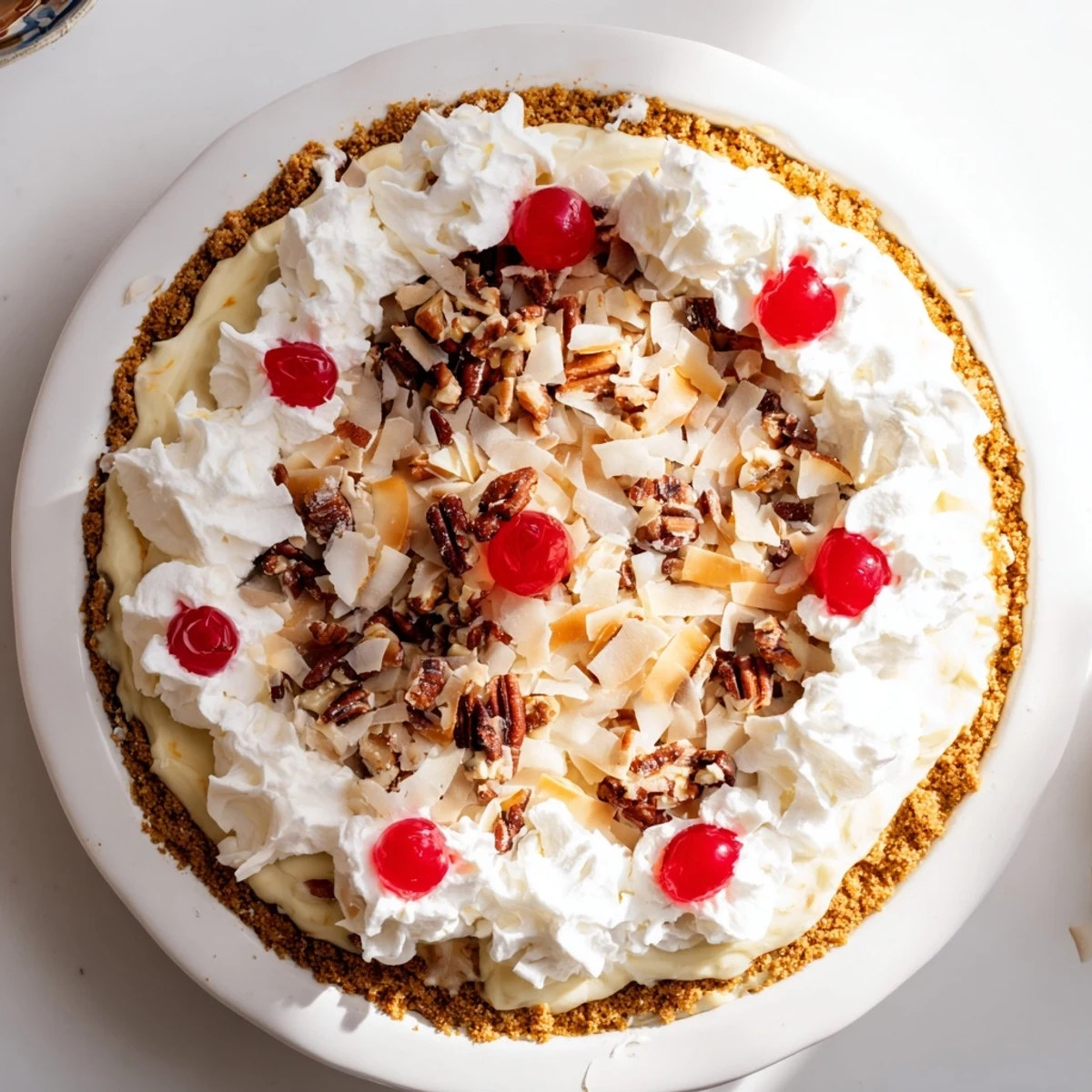 Top with extra whipped topping, chopped pecans, maraschino cherries, and shredded coconut for an appealing finish.