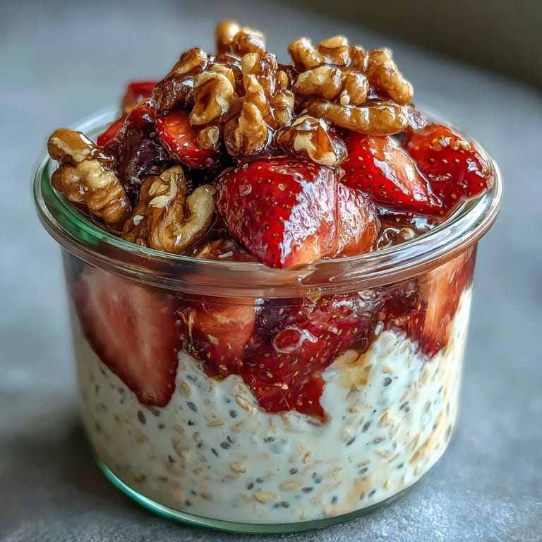 Layer the chilled oat base with fresh strawberries and candied walnuts in jars or bowls, and enjoy immediately. Optional toppings like extra berries or a drizzle of maple syrup enhance flavor.